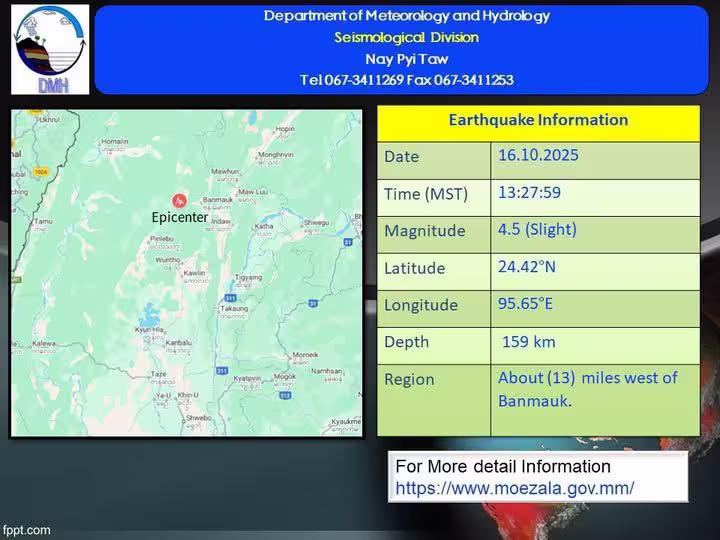 ■ ယနေ့ အောက်တိုဘာ ၁၆ ရက်၊ မြန်မာစံတော်ချိန် နေ့လည် (၁)နာရီ၊ (၂၇)မိနစ်၊ (၅၉) စက္ကန့်အချိန်တွင်စစ်ကိုင်းတိုင်းဒေသကြီး(အထက်ပိုင်း)၊ ဗန်းမောက်မြို့အနီး၌ အင်အား ရစ်(ခ်)တာစကေး (၄.၅) အဆင့်ရှိ မြေငလျင်တစ်ခု လှုပ်ရှားသွားခဲ့ကြောင်း ၊အဆိုပါ မြေငလျင်သည် ကသာမြေငလျင်စခန်းမှ အနောက်မြောက်ဘက် (၄၆) မိုင်ခန့်ကွာဝေးသော မြန်မာနိုင်ငံ ပြည်တွင်း (ဗန်းမောက်မြို့၏ အနောက်ဘက် (၁၃) မိုင်ခန့်အကွာ) မြောက်လတ္တီတွဒ် (၂၄.၄၂) ဒီဂရီ၊ အရှေ့လောင်ဂျီတွဒ် (၉၅.၆၅) ဒီဂရီ၊ အနက် (၁၅၉) ကီလိုမီတာကို ဗဟိုပြု၍ လှုပ်ခတ်ခဲ့ခြင်းဖြစ်ကြောင်း သိရသည်။