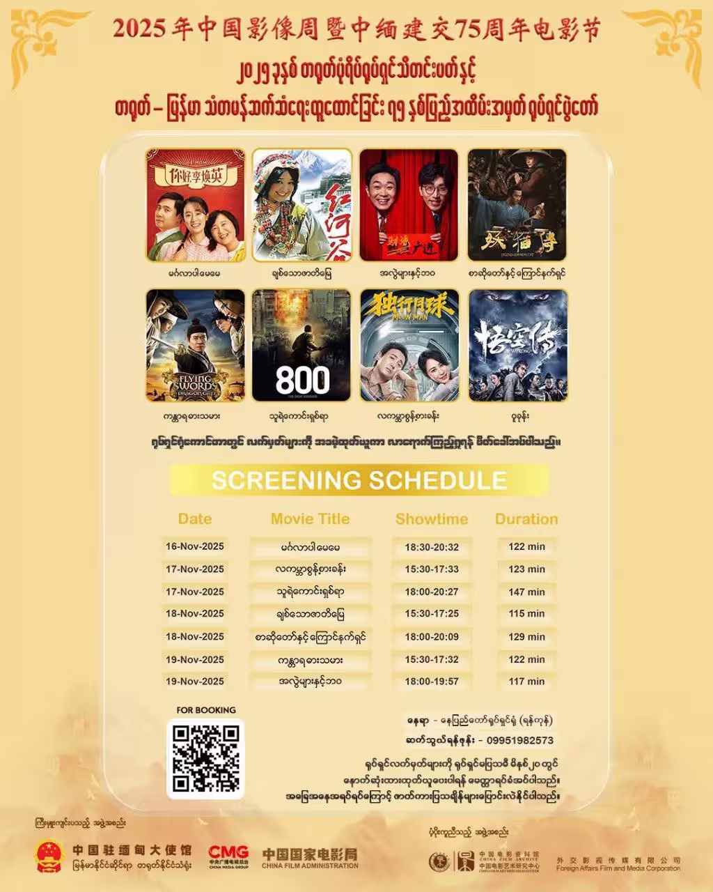 ▪️ ၂၀၂၅ ခုနှစ် တရုတ်ပုံရိပ်ရုပ်ရှင်သီတင်းပတ်နှင့် တရုတ်-မြန်မာ သံတမန်ဆက်ဆံရေးထူထောင်ခြင်း(၇၅) နှစ်ပြည့် အထိမ်းအမှတ်ရုပ်ရှင်ပွဲတော်ကို နိုဝင်ဘာ ၁၆ ရက်မှ နိုဝင်ဘာ ၁၉ ရက်အထိကျင်းပသွားမည်ဖြစ် ကြောင်း မြန်မာနိုင်ငံဆိုင်ရာ တရုတ်သံရုံးမှ သိရသည်။
