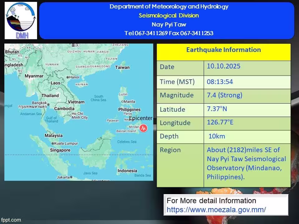 ▪️ ၂၀၂၅ ခုနှစ်၊ အောက်တိုဘာလ ၁၀ ရက်နေ့၊ မြန်မာစံတော်ချိန် (၀၈) နာရီ၊ (၁၃) မိနစ်၊ (၅၄) စက္ကန့် အချိန်တွင် နေပြည်တော်မြေငလျင်စခန်းမှ အရှေ့တောင်ဘက် (၂၁၈၂) မိုင်ခန့်ကွာဝေးသော မြန်မာနိုင်ငံပြည်ပ (Mindanao, Philippines)၌ လှုပ်ခတ်ခဲခြင်းဖြစ်သည်။