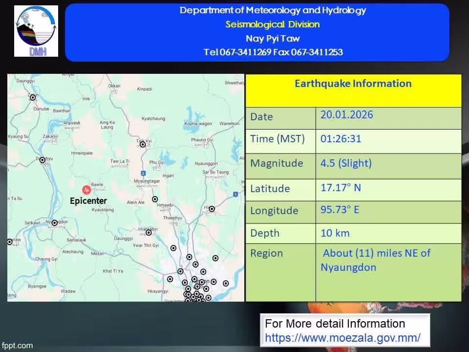 ▪️ ထို့အတူဇန်နဝါရီလ ၂၀ ရက်နေ့၊ မြန်မာစံတော်ချိန် (၀၁) နာရီ၊ (၂၆) မိနစ်၊ (၃၁) စက္ကန့်အချိန်တွင် ကမ္ဘာအေးမြေငလျင်စခန်းမှ အနောက်မြောက်ဘက် (၃၅) မိုင်ခန့်ကွာဝေးသော မြန်မာနိုင်ငံ ပြည်တွင်း (ညောင်တုန်းမြို့၏ အရှေ့မြောက်ဘက် (၁၁) မိုင်ခန့်အကွာ)၊ မြောက်လတ္တီတွဒ် (၁၇.၁၇) ဒီဂရီ၊ အရှေ့လောင်ဂျီတွဒ် (၉၅.၇၃) ဒီဂရီ၊ အနက် (၁၀) ကီလို မီတာကို ဗဟိုပြု၍ အင်အား ရစ်(ခ်)တာစကေး (၄.၅) အဆင့်ရှိ အင်အားအနည်းငယ်ရှိသော မြေငလျင်တစ်ခု လှုပ်ရှားသွားကြောင်း သိရသည်။