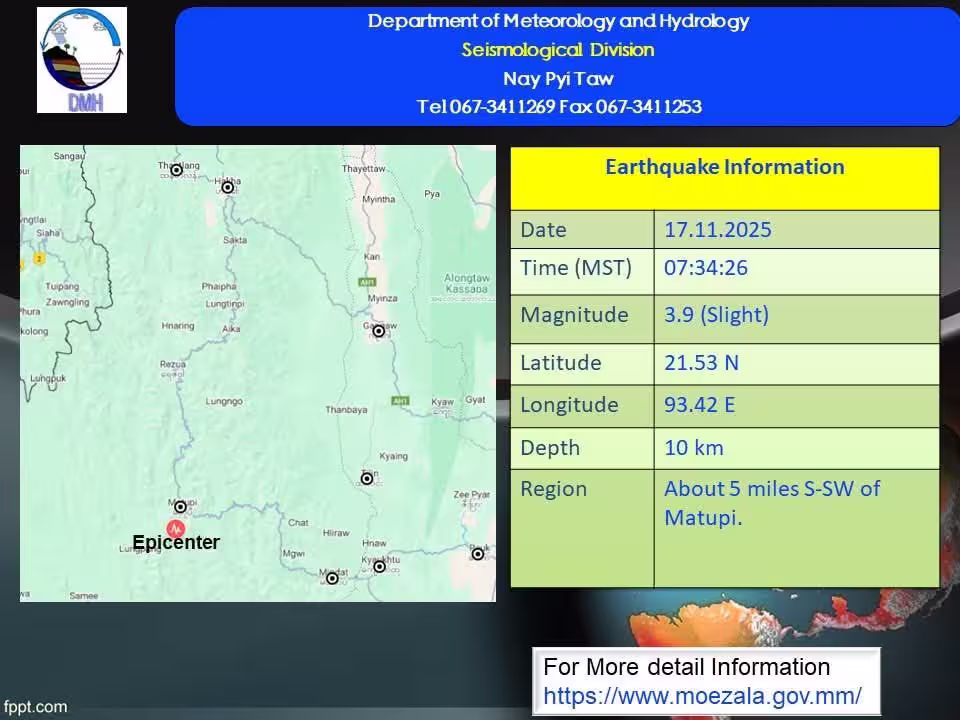 ■ မတူပီမြို့အနီး၌ အင်အားအနည်းငယ်ရှိသော မြေငလျင်တစ်ခု ယနေ့မနက်ပိုင်းက လှုပ်ခတ်ခဲ့ကြောင်းသိရသည်။
