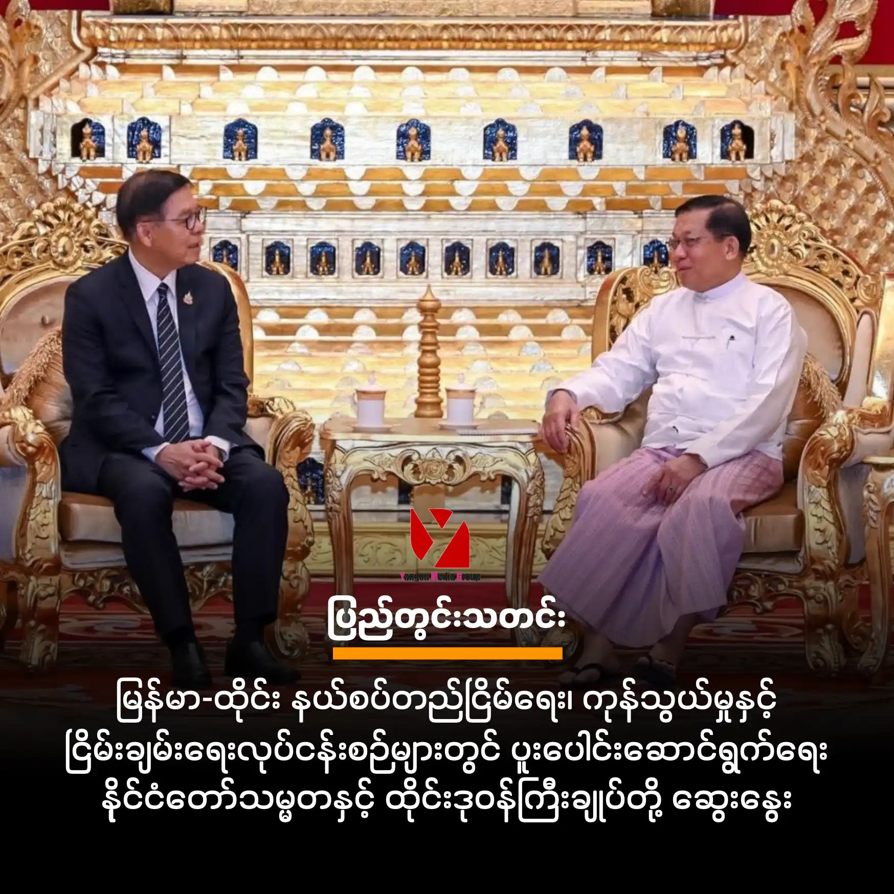 နေပြည်တော်၊ ဧပြီ ၂၂ - နိုင်ငံတော်သမ္မတ ဦးမင်းအောင်လှိုင်နှင့် ထိုင်းနိုင်ငံ ဒုတိယဝန်ကြီးချုပ်နှင့် နိုင်ငံခြားရေးဝန်ကြီး Mr. Sihasak Phuangketkaew တို့သည် ယနေ့နံနက်ပိုင်းက နေပြည်တော်၌ တွေ့ဆုံခဲ့ပြီး နှစ်နိုင်ငံနယ်စပ်ဒေသ တည်ငြိမ်အေးချမ်းရေး၊ ကုန်သွယ်မှုမြှင့်တင်ရေးနှင့် မြန်မာ့ ငြိမ်းချမ်း ရေးလုပ်ငန်းစဉ်များတွင် ပူးပေါင်းဆောင်ရွက်ရေး ကိစ္စရပ်များကို အဓိကထား ဆွေးနွေးခဲ့ကြသည်။