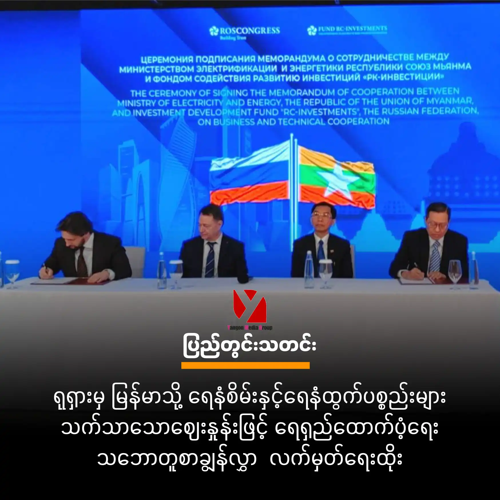 ရုရှားနိုင်ငံမှ မြန်မာနိုင်ငံသို့ သဘာဝဓာတ်ငွေ့ရည် (LNG)၊ ရေနံဓာတ်ငွေ့ရည် (LPG)၊ ဓာတ်မြေဩဇာနှင့် ရေနံစိမ်းကုန်ကြမ်းများကို သက်သာသော ဈေးနှုန်းဖြင့် ရရှိရေး၊ အရည်အသွေးနှင့် လမ်းခရီးလုံခြုံမှု အာမခံချက်ရှိစေရေး ရည်ရွယ်ချက်ဖြင့် မြန်မာနိုင်ငံ လျှပ်စစ်နှင့် စွမ်းအင်ဝန်ကြီးဌာနနှင့် ရုရှားနိုင်ငံ Investment Development Fund “RC Investments” တို့အကြား စီးပွားရေးနှင့် နည်းပညာဆိုင်ရာ ပူးပေါင်းဆောင်ရွက်မှုစာချွန်လွှာ (Memorandum Of Cooperation - MOC) ကို ၂၀၂၆ ခုနှစ်၊ ဧပြီလ ၁၆ ရက်နေ့တွင် ရုရှားနိုင်ငံ၌ လက်မှတ်ရေးထိုးခဲ့သည်။