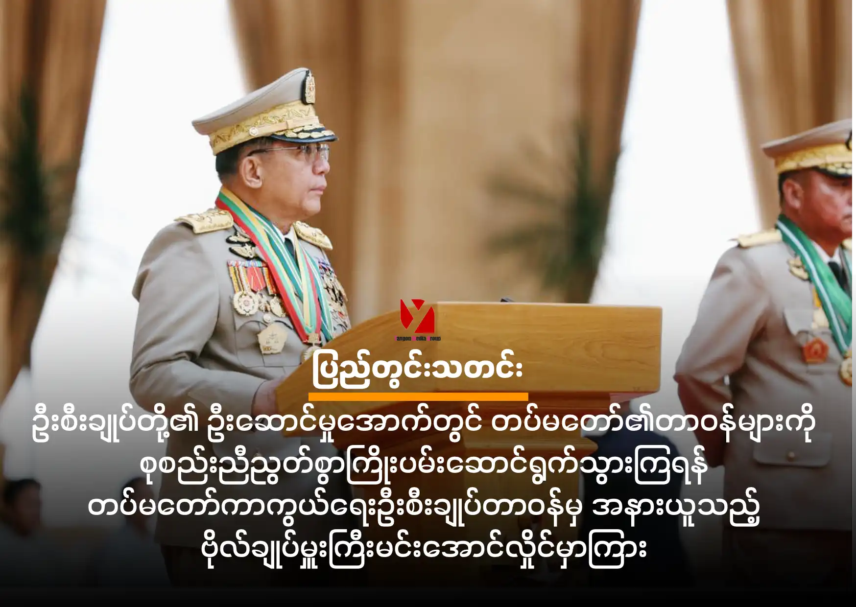 ဦးစီးချုပ်တို့၏ ဦးဆောင်မှုအောက်တွင် တပ်မတော်၏ တာဝန်များကို စုစည်းညီညွတ်စွာဖြင့်ကြိုးပမ်း ဆောင်ရွက်ကြရန် တပ်မတော်ကာကွယ်ရေးဦီးစီးချုပ်တာဝန်များကို လွှဲပြောင်းပေးအပ်ခဲ့တဲ့ ဗိုလ်ချုပ်မှူး ကြီးမင်းအောင်လှိုင်က ပြောကြားပါတယ်။