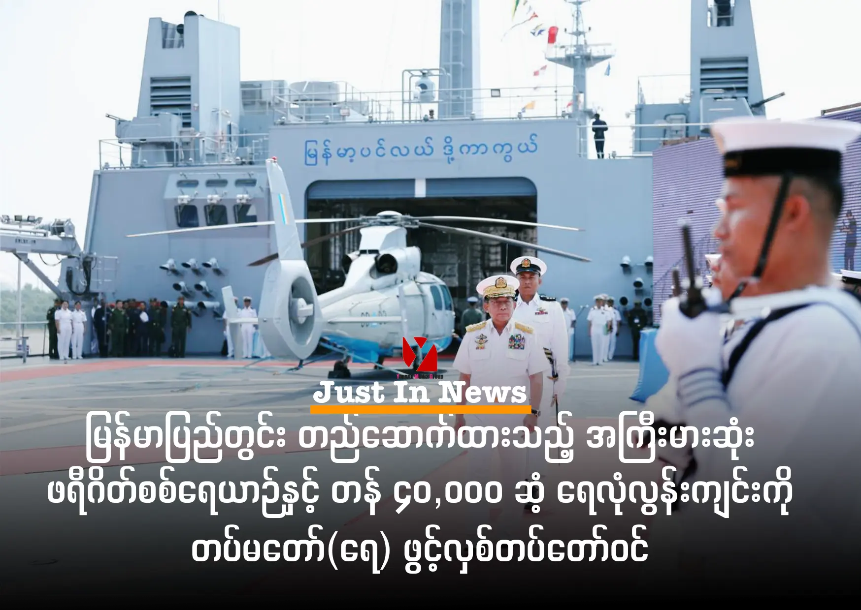 ရန်ကုန် မတ်၉ — တပ်မတော်(ရေ)၏ ရေကြောင်းကာကွယ်ရေးနှင့် ရေယာဉ်တည်ဆောက်မှုစွမ်းရည်ကို ပိုမိုတိုးချဲ့သည့်အနေဖြင့် ပြည်တွင်း၌ ကိုယ်တိုင်တည်ဆောက်ထားသော အကြီးမားဆုံး ဖရီဂိတ် စစ်ရေ ယာဉ်သစ် တပ်တော်ဝင်ခြင်းနှင့် တန် ၄၀,၀၀၀ ဆံ့ ရေလုံလွန်းကျင်းကြီး ဖွင့်လှစ်ခြင်း အခမ်းအနား ကို တနင်္ဂနွေနေ့ နံနက်ပိုင်းက ရန်ကုန်မြို့တွင် ကျင်းပခဲ့သည်။