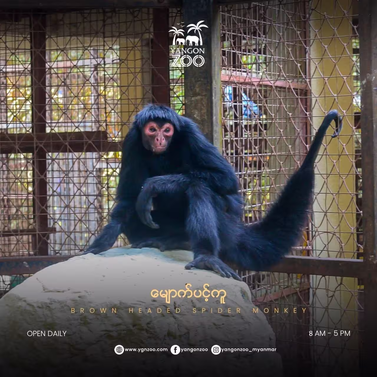 ■ မျိုးပြုန်းပျောက်ကွယ်မည့်ဘေးနှင့် ရင်ဆိုင် နေရပြီးလူသားတို့၏ ထိန်းသိမ်းစောင့်ရှောက်မှုကို လိုအပ်သောမျောက်ပင့်ကူ ( Brown Headed Spider Monkey ) များအား ရန်ကုန်တိရစ္ဆာန်ဥယျာဥ်တွင် ပြသထားရာ လာရောက်လေ့လာနိုင်မည်ဖြစ်ကြောင်း သိရသည်။