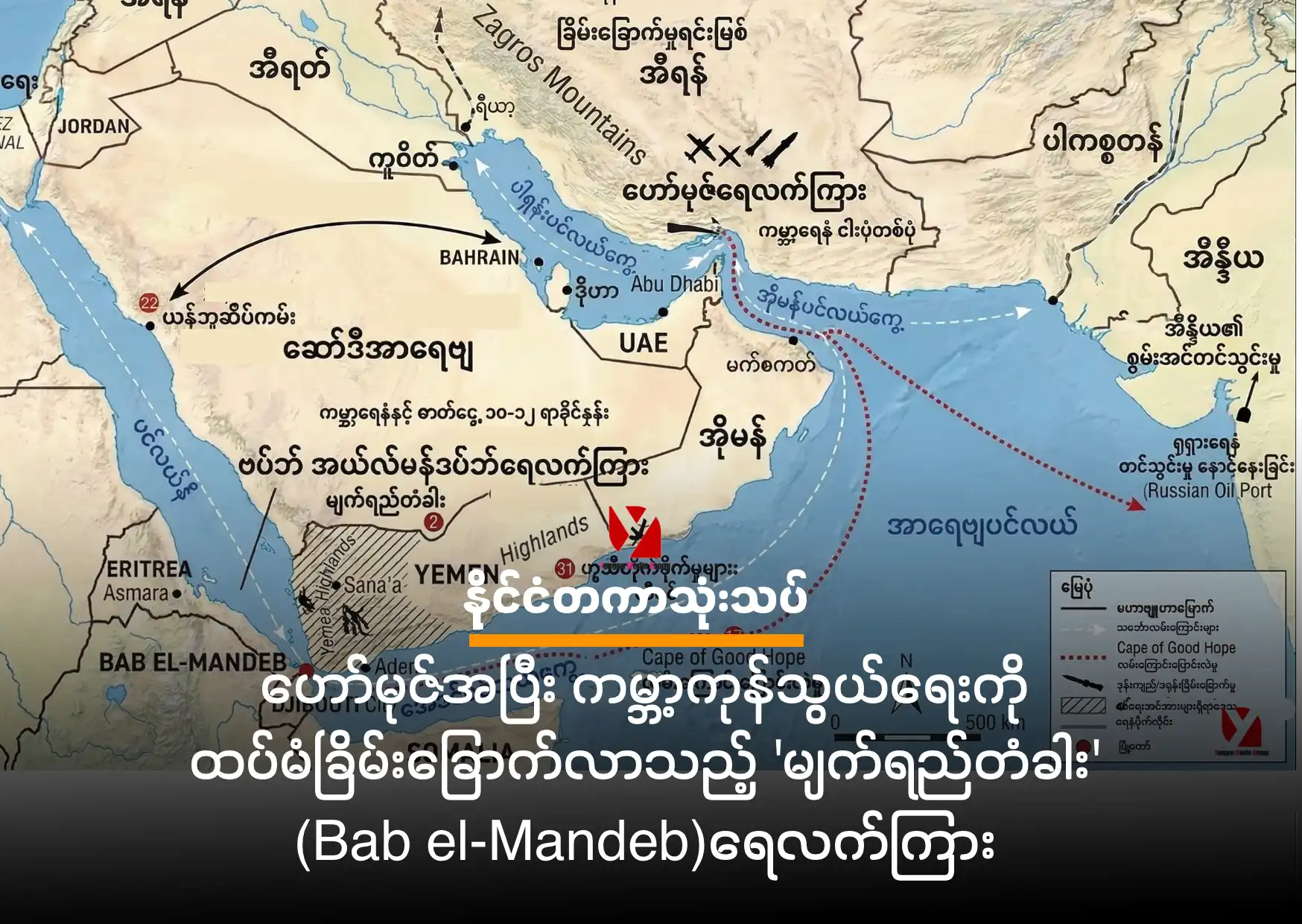အရှေ့အလယ်ပိုင်းဒေသတွင်း အမေရိကန်၊ အစ္စရေးနဲ့ အီရန်တို့ကြား ပဋိပက္ခတွေ ကြီးထွားလာတာနဲ့အမျှ ကမ္ဘာ့စွမ်းအင်ဈေးကွက်ရဲ့ အာရုံစိုက်မှုဟာ ဟော်မုဇ်ရေလက်ကြား (Strait of Hormuz) ကနေတဆင့် တောင်ဘက်မှာရှိတဲ့ မျက်ရည်တံခါးလို့ အမည်ပေးထားတဲ့ Bab el-Mandeb ရေလက်ကြားဆီကို ရွေ့ လျားလာနေပြီ ဖြစ်ပါတယ်။ ခေတ်သစ် သမိုင်းတစ်လျှောက် ကမ္ဘာ့စွမ်းအင်ဈေးကွက်ကို အဆိုးရွားဆုံး ထိခိုက်စေမယ့် ဒုတိယမြောက် စစ်မျက်နှာစာတစ်ခုအဖြစ် အဆိုပါရေလက်ကြားက ထွက်ပေါ်လာနေပါတယ်။